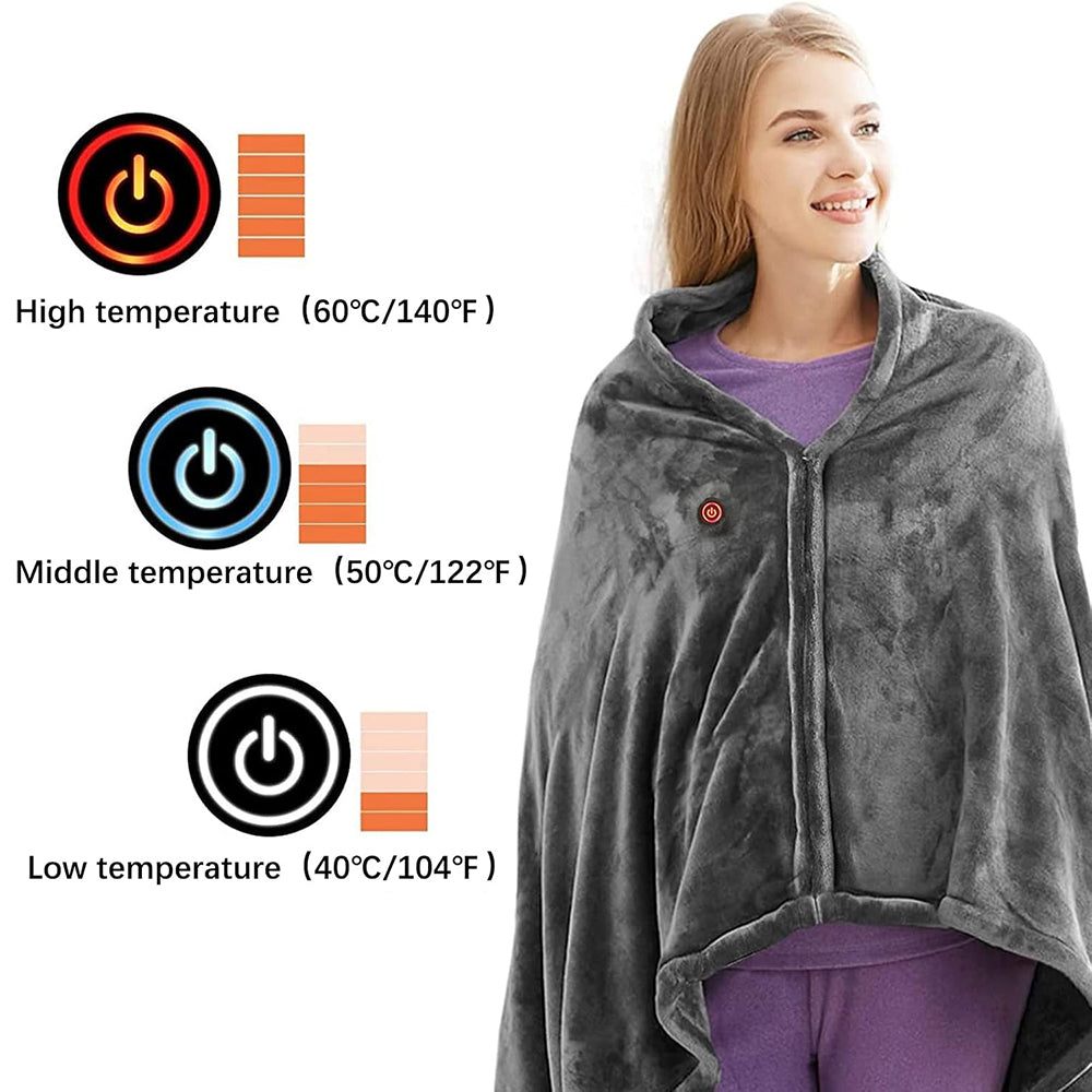 Heated Warm Shawl Fast heating in seconds! 3-temperature Level settings, 40 degrees, 50 degrees, 60 degrees. It can be used as a multifunctional heating pad for back, abdomen or knee on the bed or sofa.