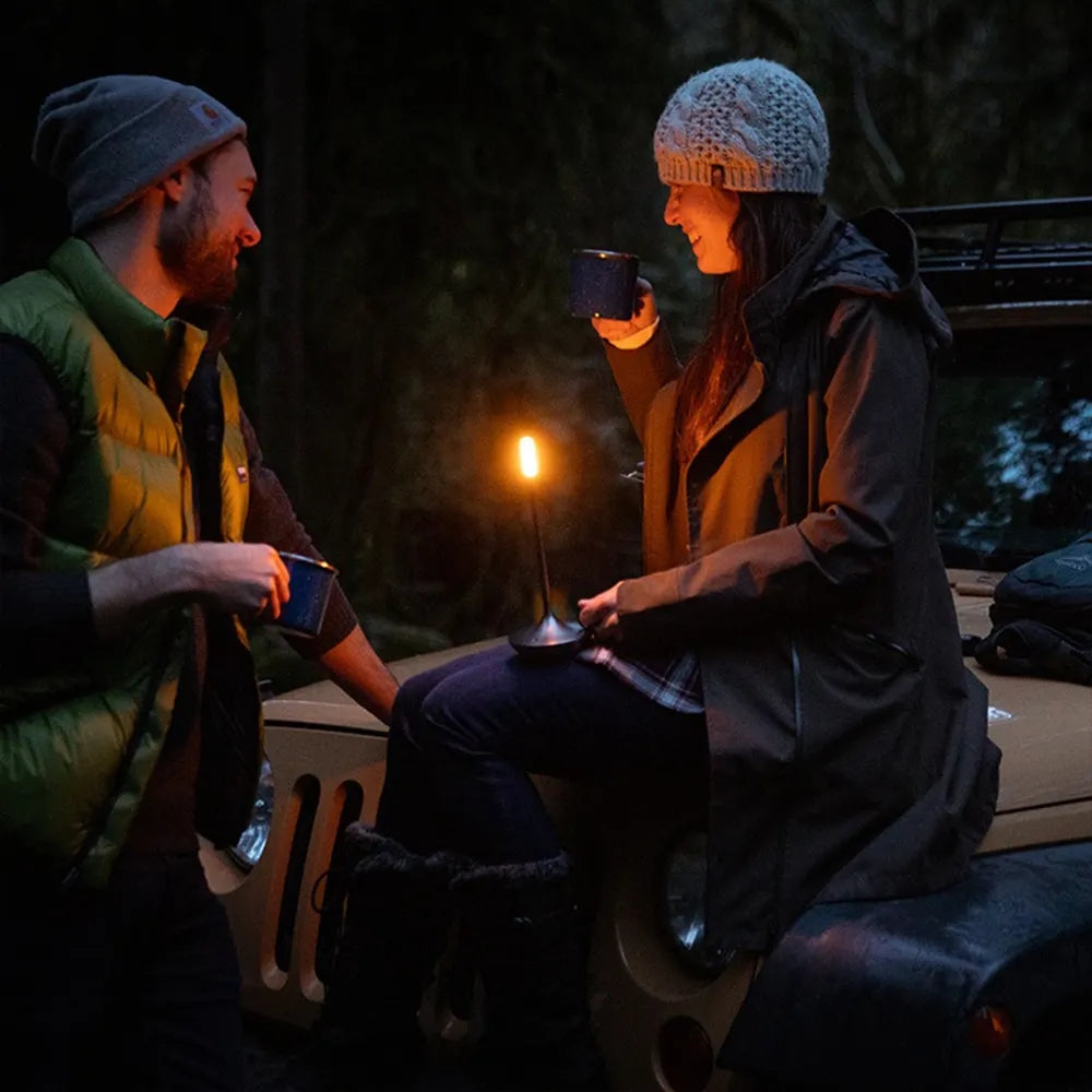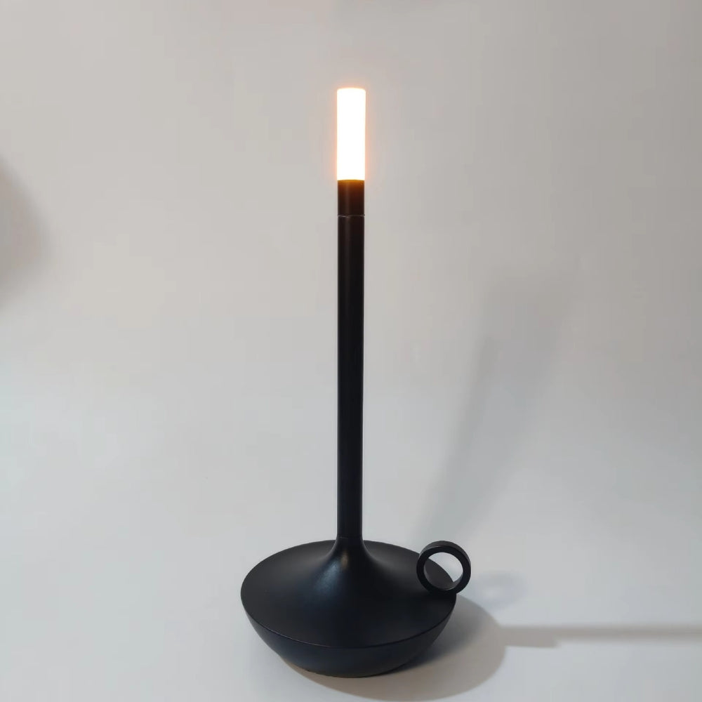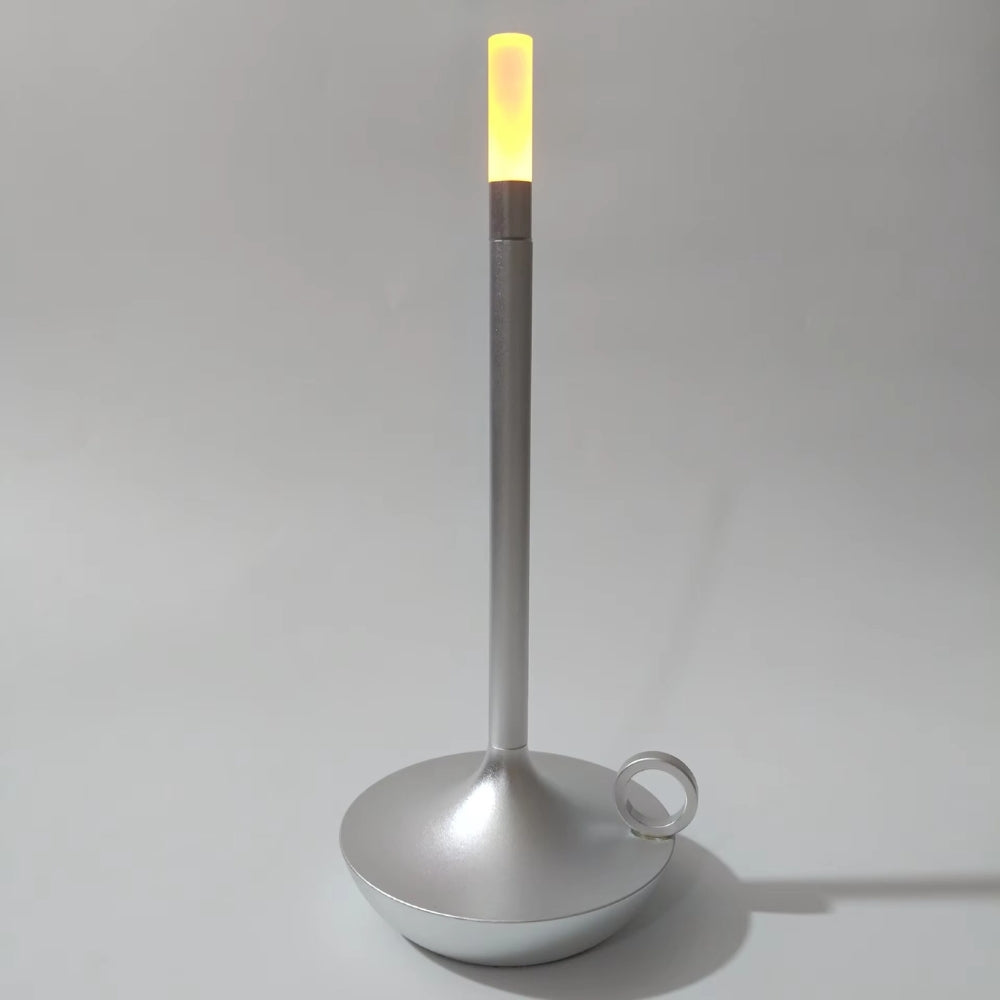This minimalist portable candle table lamp is designed with a sleek and elegant aluminum alloy body. It features a simple outline and offers 360-degree lighting, making it a standout piece in any setting, both indoors and outdoors. The sturdy yet lightweight material adds to its durability and charm, while the candle design enhances its appeal during nighttime.