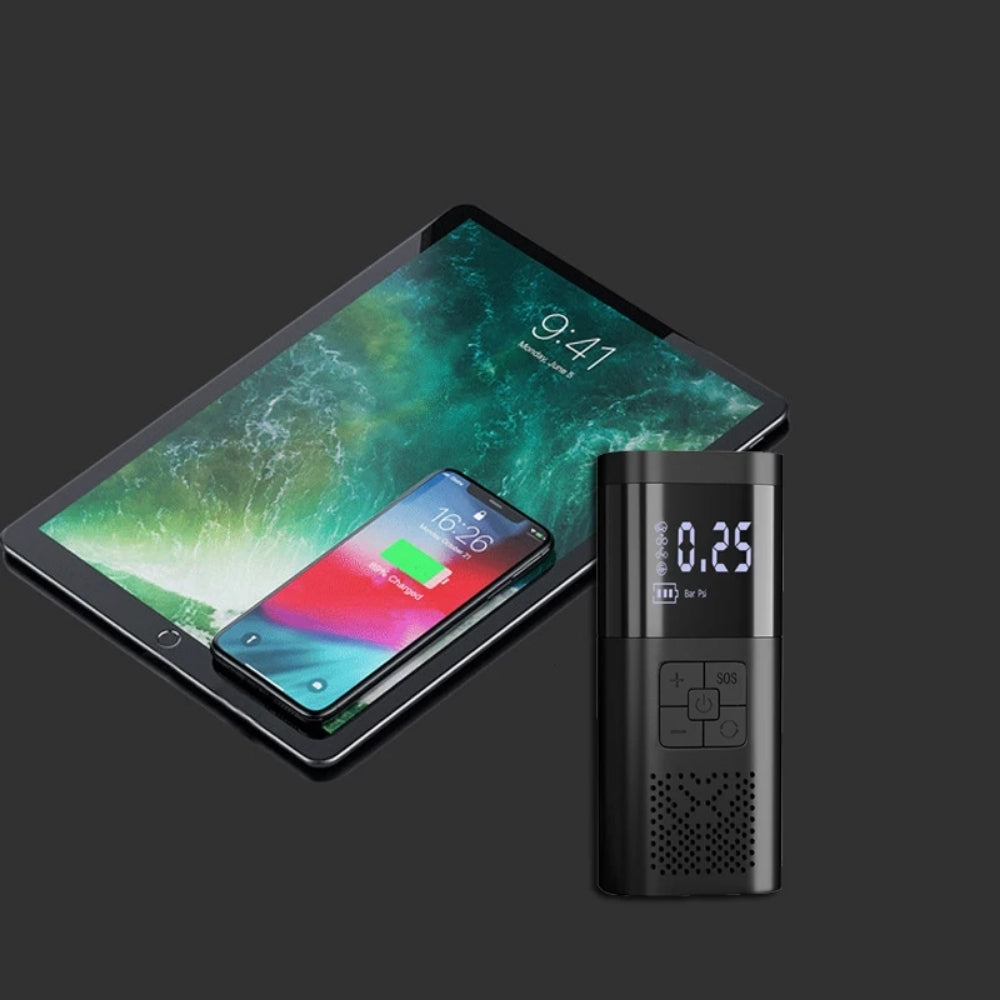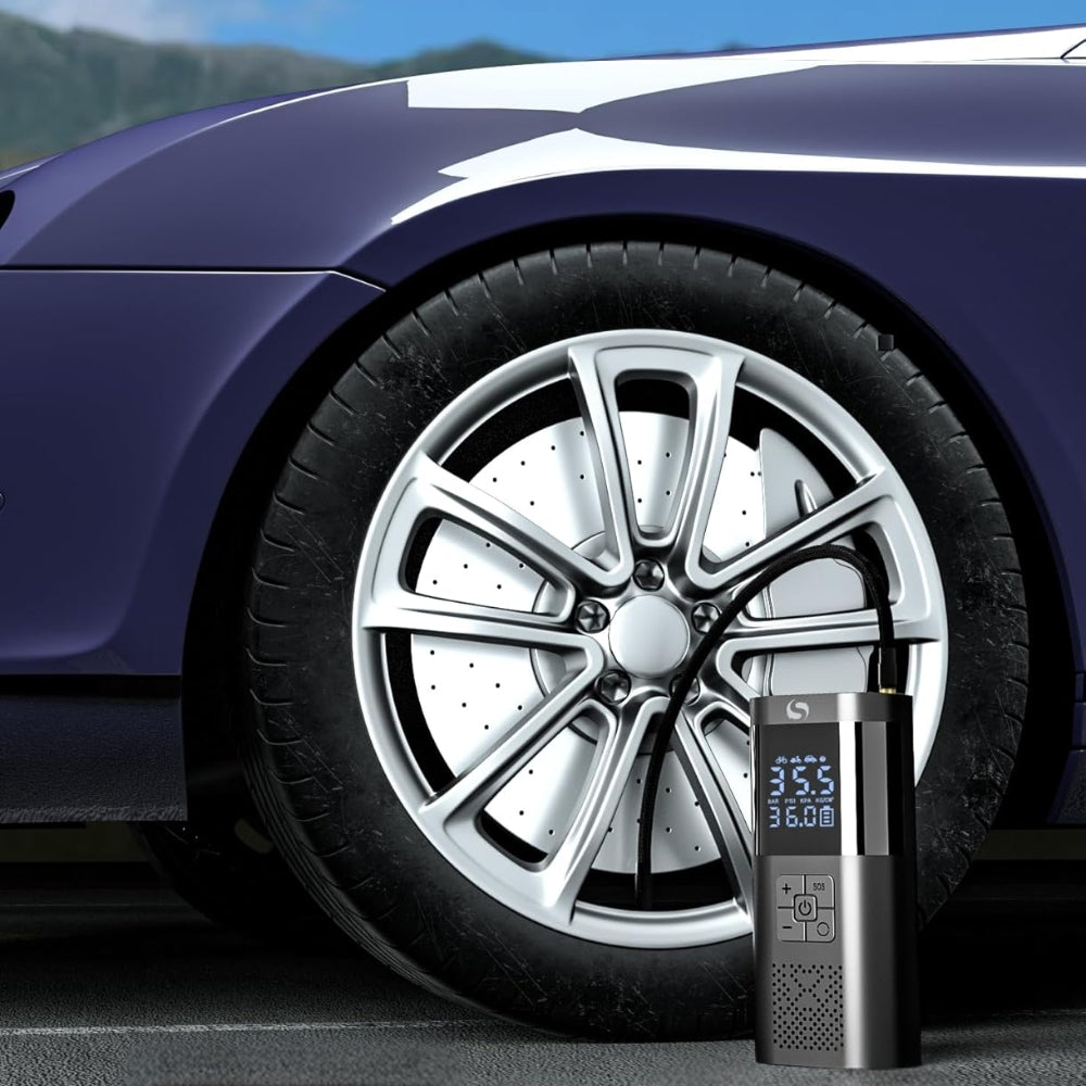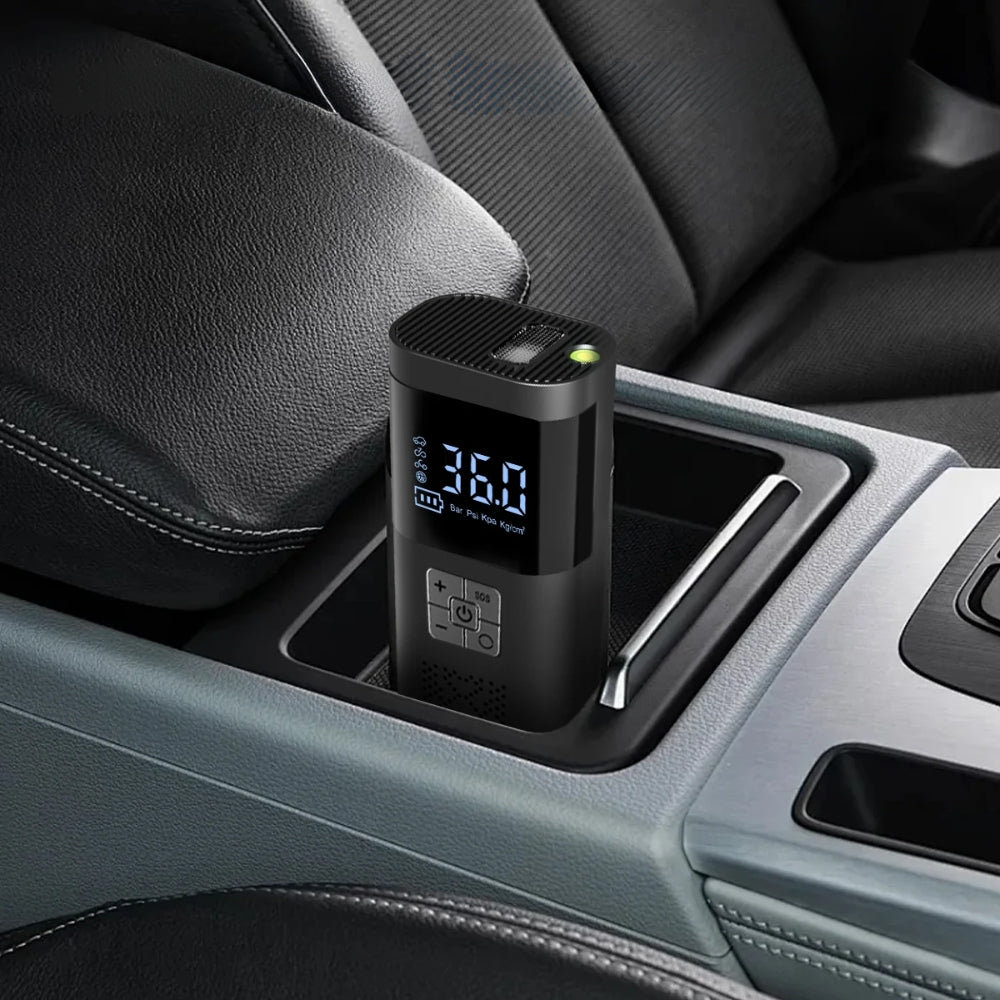 The portable air compressor offers fast, cordless tire inflation with a powerful 1500mAh rechargeable battery. It delivers 35% more power and inflates up to three times faster than standard models—no external power needed.