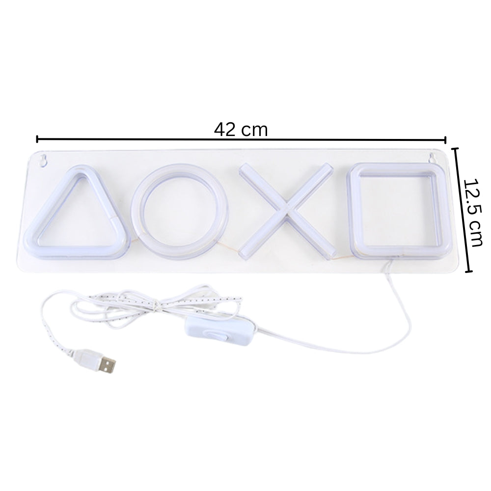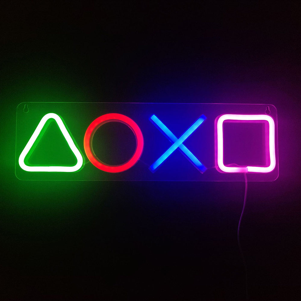The Neon Sign Custom PS4 Game Icon Light features the iconic PlayStation controller buttons in their signature colors, with bright silicone LED tubes mounted on a clear acrylic base. This unique addition adds personality and a colorful touch to any room.