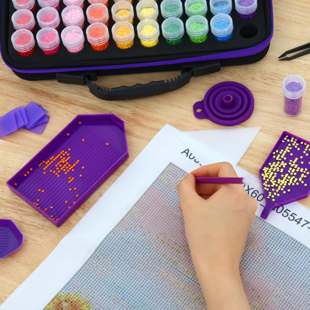 The Diamond Painting Storage Box with Accessories and Shockproof Jars is the all-in-one solution for keeping diamond painting supplies neat and organized. Equipped with a large-capacity case, it includes multiple compartments for sorting beads, trays, and tools, while a mesh pocket provides extra space for accessories.